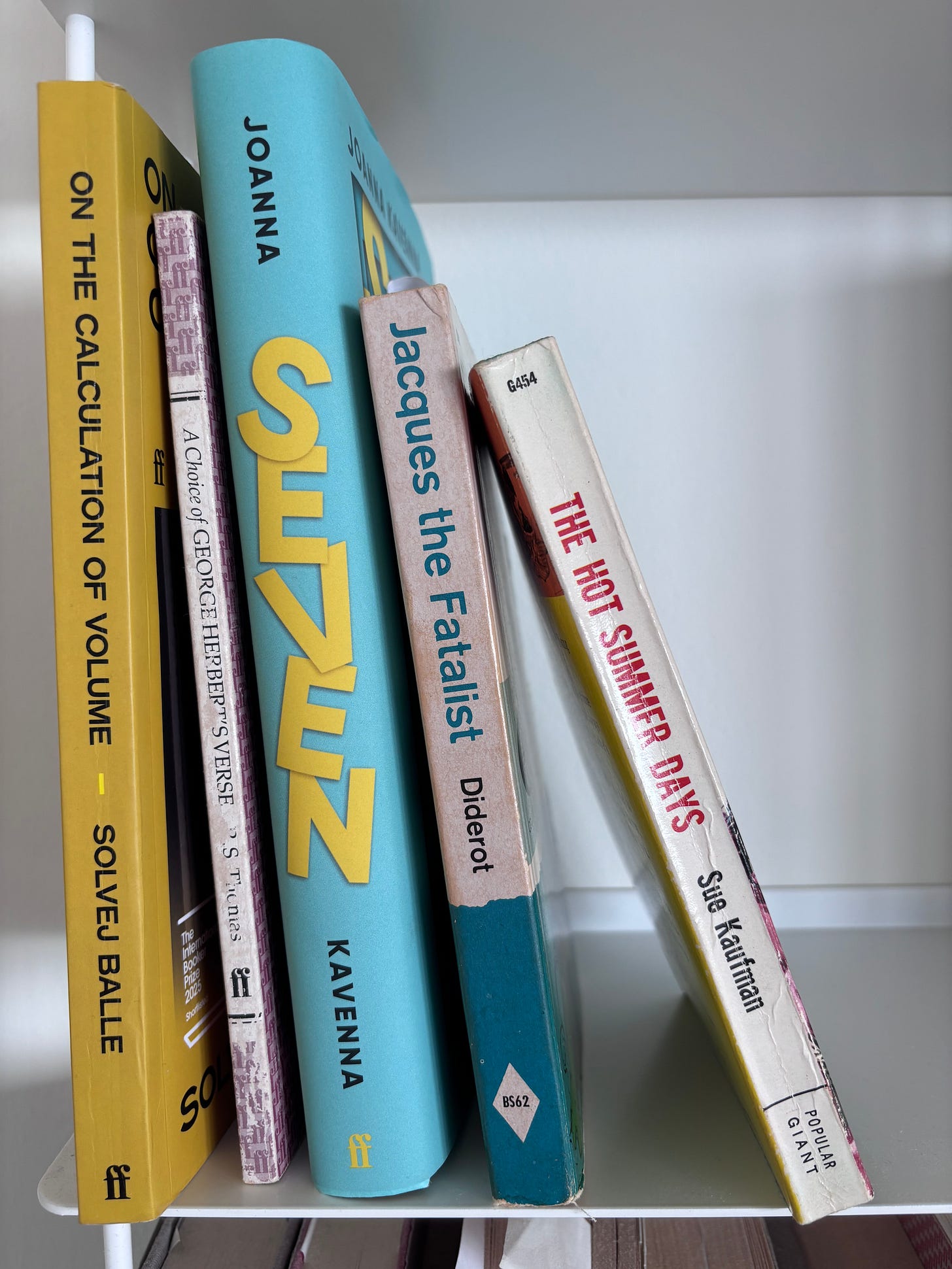 I spent most of the time on the bus to Stansted and the Ryanair flight reading Jacques the Fatalist and His Master. It’s as clever and ambitious as you might expect from the great encylopedist, clearly in debt to Sterne’s Tristram Shandy, with longueurs, interruptions, questions about its own standing, and enough philosophy and jokes to make Kavenna happy and R.S. Thomas annoyed. Its central questions are about fate and freedom and free will and when I got through passport control at Vienna airport I realised four things: that all the reading matter on this shelf, apart from the Sue Kaufman book, which I’ll write about another time, are first-person narratives; that they might actually be ‘about’ those same questions of fate and free will and design and chance; thirdly, that maybe all literature is about those things, in which case why bother asking the question at all; but as I was puzzling over that, and deciding that they had to be each about something else as well, rather as The Big Sleep is less about its plot and more about the experience of Bogart and Bacall in a room, and why bother reading unless we are open to being changed, the fourth thing I realised was that I’d inadvertently left Jacques the Fatalist behind in the seat pocket of the plane, and I supposed I had to take that loss as if it was meant to be.
