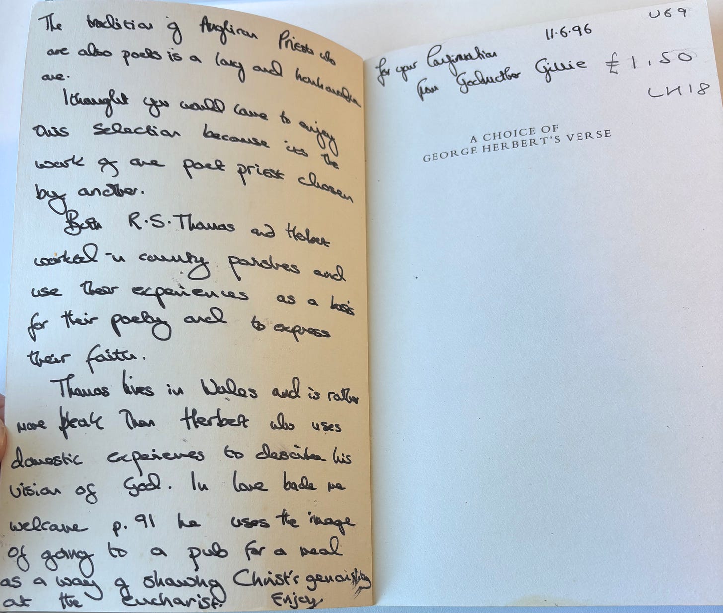 But it’s so poignant. Godfather Gillie might be a priest himself. Maybe he even wrote some poetry, which I’m imagining as carefully shaped, showing his receptiveness to nature and beauty and other examples of what he would celebrate as God’s handiwork, or maybe even ‘Handiwork’. Here, he’s doing his best as a godfather (at least I think that’s ‘Godfather’ in his signature) to find something to appeal to his young friend, or charge, or confirmee. The ‘I thought you would come to enjoy this selection because it is the work of one poet priest chosen by another’ is sweetly, forlornly hopeful, an expression of his interests that he wants to reveal while knowing that it won’t be shared. Also forlorn is his attempt to cast the setting of the poem on p.91 as the visit to a ‘pub’. I’m taking it as a rough try at being thought relevant. And making a poem written around 1630 appear contemporary to a late-twentieth century reader who had no interest in it. All of this is poignant, and quite painful: the acknowledgment that the fruits of this gift can only arrive in some unknown conditional future (‘would come to enjoy’) rather than be open to pleasure quite yet, the dogged attempt to make a connection, to give something suitably exalted on the occasion of the boy’s confirmation.
